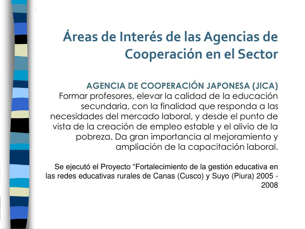 Áreas de Interés de las Agencias de Cooperación en el Sector AGENCIA DE COOPERACIÓN JAPONESA (JICA) Formar profesores, elevar la calidad de la educación secundaria, con la finalidad que responda a las necesidades del mercado laboral, y desde el punto de vista de la creación de empleo estable y el alivio de la pobreza. Da gran importancia al mejoramiento y ampliación de la capacitación laboral. Se ejecutó el Proyecto “Fortalecimiento de la gestión educativa en las redes educativas rurales de Canas (Cusco) y Suyo (Piura) 2005 - 2008