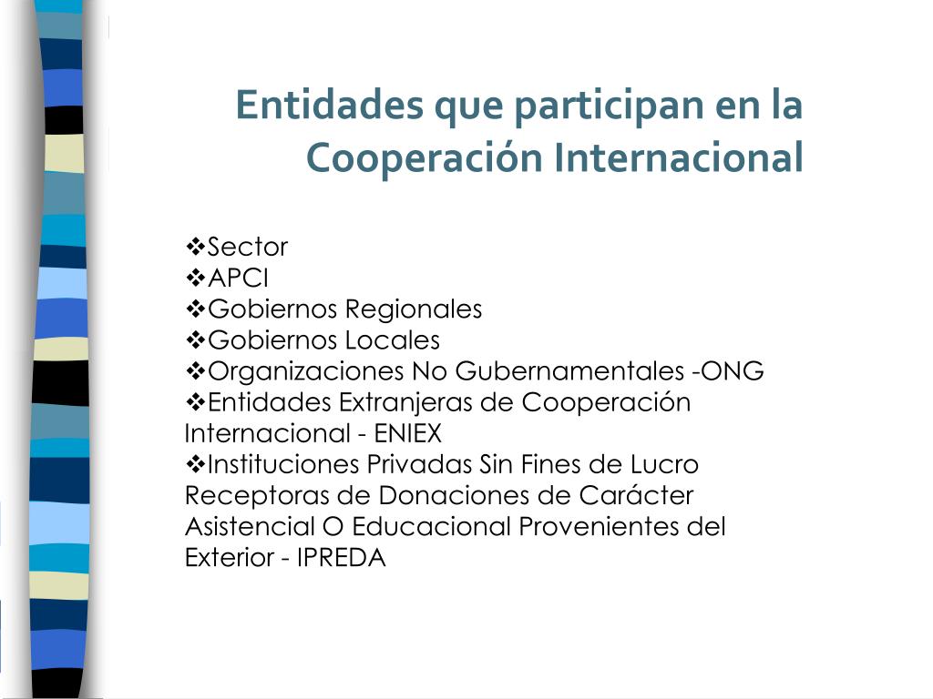 Entidades que participan en la Cooperación Internacional • Sector • APCI • Gobiernos Regionales • Gobiernos Locales • Organizaciones No Gubernamentales -ONG • Entidades Extranjeras de Cooperación Internacional - ENIEX • Instituciones Privadas Sin Fines de Lucro Receptoras de Donaciones de Carácter Asistencial O Educacional Provenientes del Exterior - IPREDA