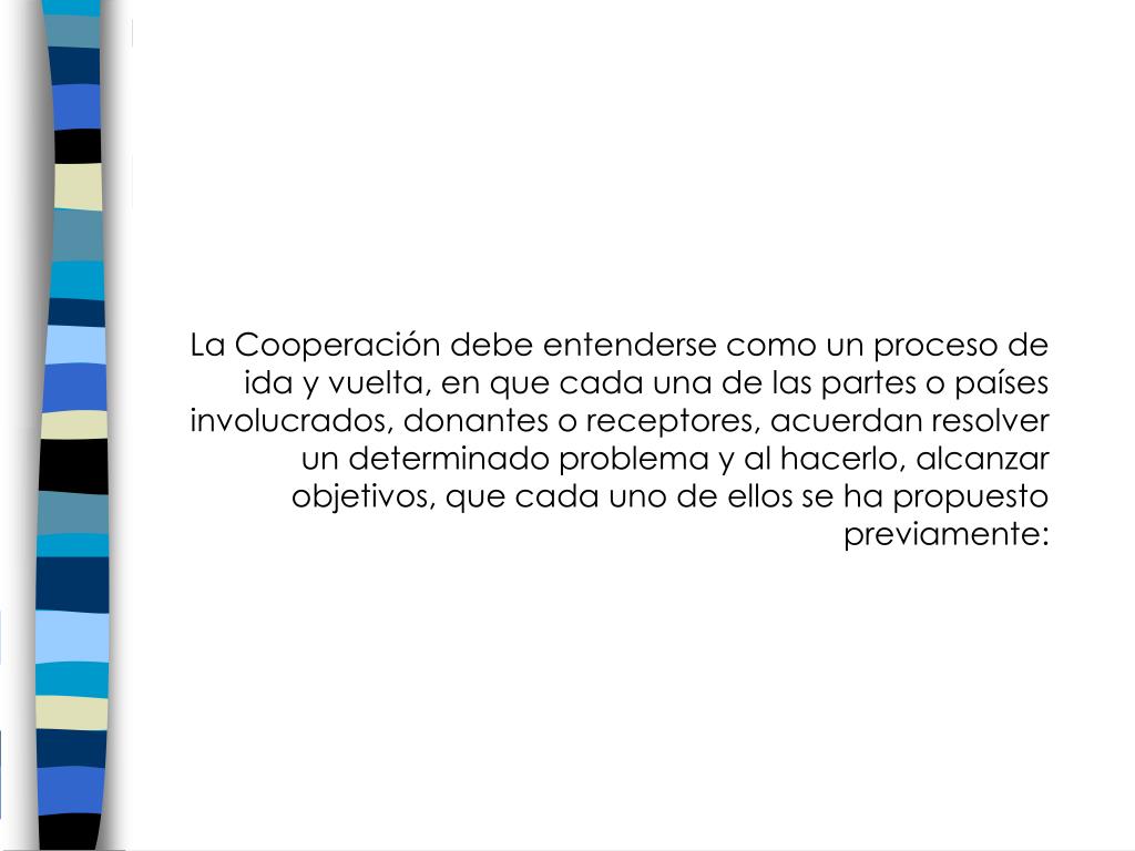 La Cooperación debe entenderse como un proceso de ida y vuelta, en que cada una de las partes o países involucrados, donantes o receptores, acuerdan resolver un determinado problema y al hacerlo, alcanzar objetivos, que cada uno de ellos se ha propuesto previamente: