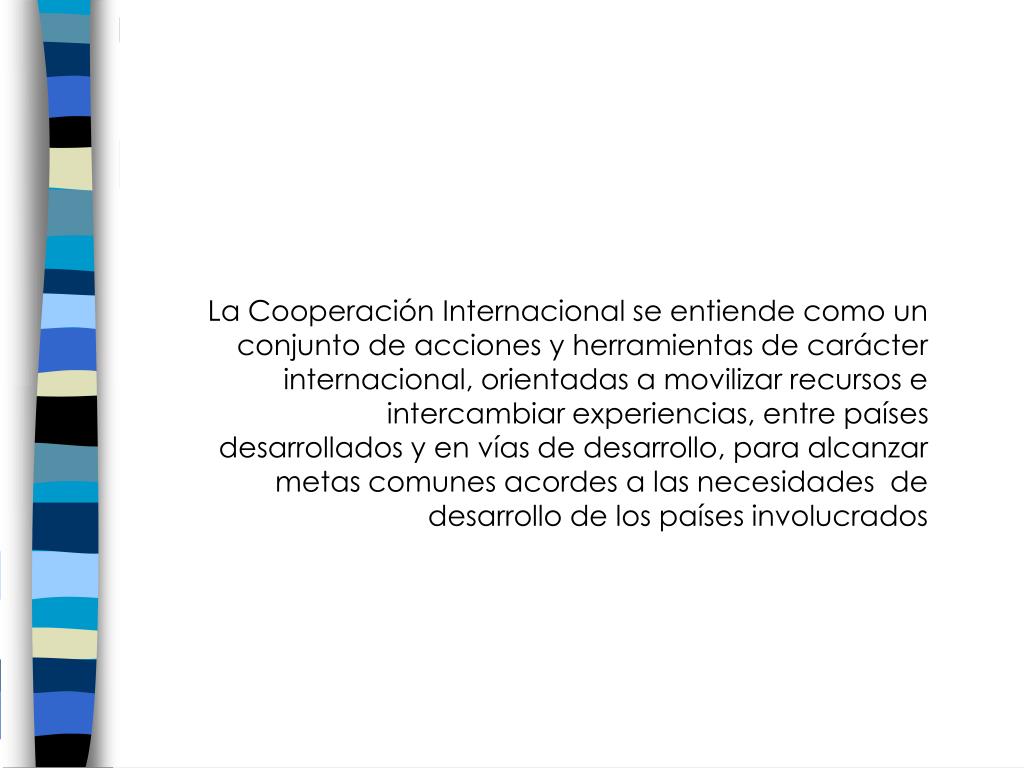 La Cooperación Internacional se entiende como un conjunto de acciones y herramientas de carácter internacional, orientadas a movilizar recursos e intercambiar experiencias, entre países desarrollados y en vías de desarrollo, para alcanzar metas comunes acordes a las necesidades de desarrollo de los países involucrados