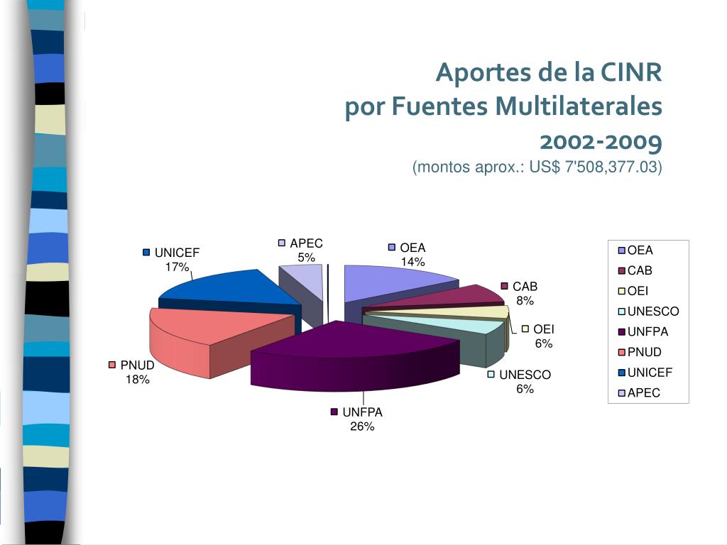 Agencias de Cooperación Multilaterales • Fondo de Población de las Naciones Unidas –UNFPA • Programa de las Naciones Unidas para el Desarrollo –PNUD • Organización de las Naciones Unidas para la Educación , la Ciencia y la Cultura – UNESCO • Fondo de las naciones Unidas para la Infancia - UNICEF