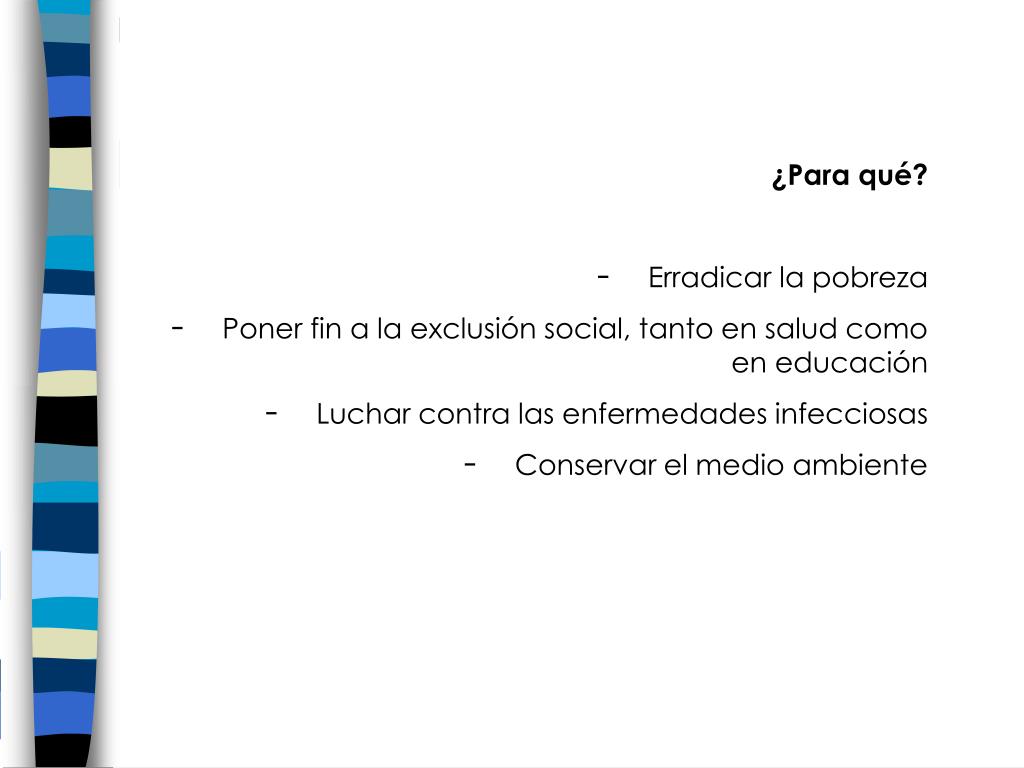 ¿Para qué? • Erradicar la pobreza • Poner fin a la exclusión social, tanto en salud como en educación • Luchar contra las enfermedades infecciosas • Conservar el medio ambiente