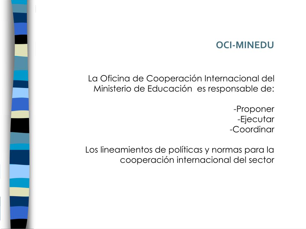 OCI-MINEDU La Oficina de Cooperación Internacional del Ministerio de Educación es responsable de: -Proponer -Ejecutar -Coordinar Los lineamientos de políticas y normas para la cooperación internacional del sector