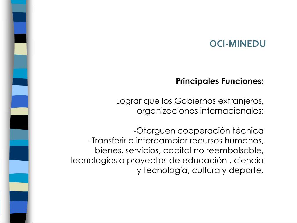 OCI-MINEDU Principales Funciones: Lograr que los Gobiernos extranjeros, organizaciones internacionales: -Otorguen cooperación técnica -Transferir o intercambiar recursos humanos, bienes, servicios, capital no reembolsable, tecnologías o proyectos de educación , ciencia y tecnología, cultura y deporte.