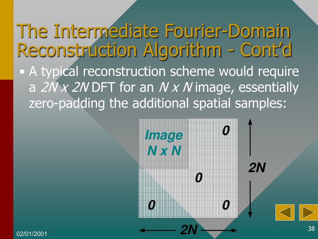 The Intermediate Fourier-Domain Reconstruction Algorithm - Cont’d A typical reconstruction scheme would require a 2N x 2N DFT for an N x N image, essentially zero-padding the additional spatial samples: