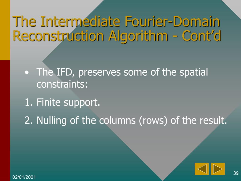 The Intermediate Fourier-Domain Reconstruction Algorithm - Cont’d • The IFD, preserves some of the spatial constraints: • Finite support. • Nulling of the columns (rows) of the result.