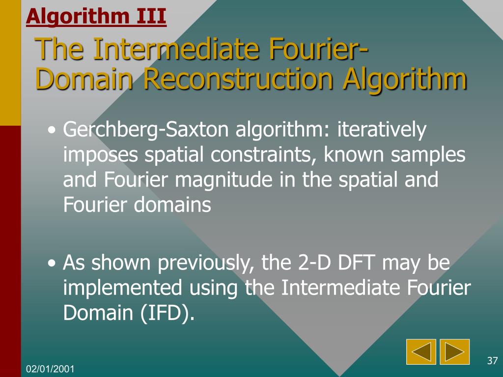 Algorithm III The Intermediate Fourier- Domain Reconstruction Algorithm Gerchberg-Saxton algorithm: iteratively imposes spatial constraints, known samples and Fourier magnitude in the spatial and Fourier domains As shown previously, the 2-D DFT may be implemented using the Intermediate Fourier Domain (IFD).