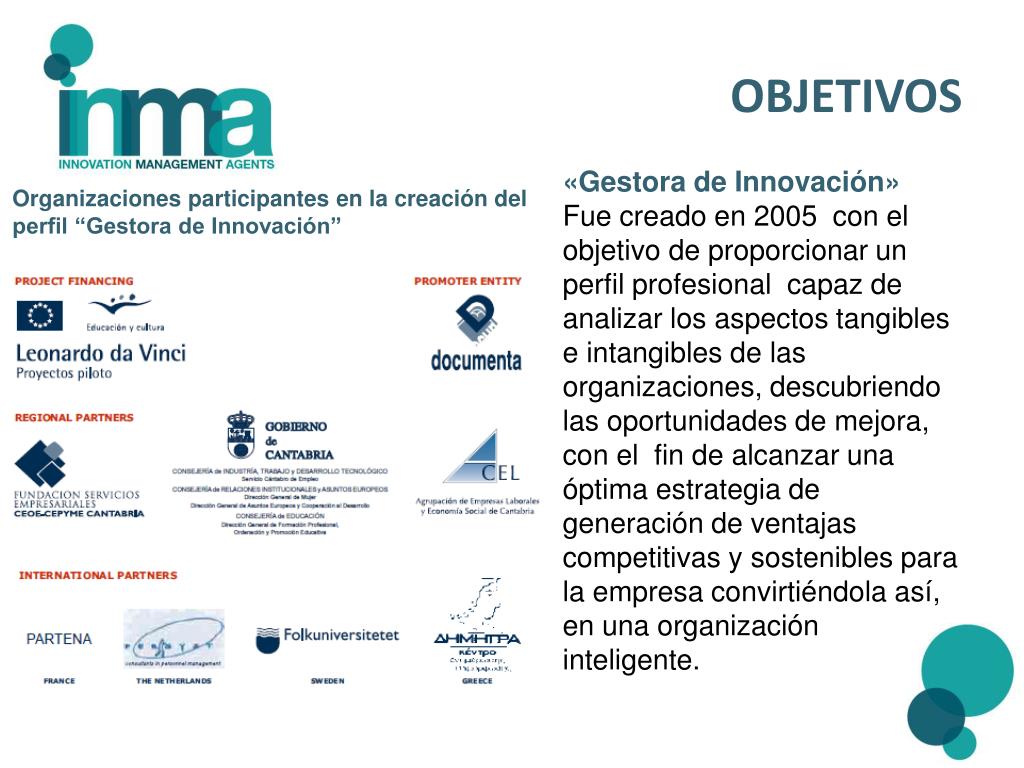 OBJETIVOS «Gestora de Innovación» Fue creado en 2005 con el objetivo de proporcionar un perfil profesional capaz de analizar los aspectos tangibles e intangibles de las organizaciones, descubriendo las oportunidades de mejora, con el fin de alcanzar una óptima estrategia de generación de ventajas competitivas y sostenibles para la empresa convirtiéndola así, en una organización inteligente. Organizaciones participantes en la creación del perfil “Gestora de Innovación”