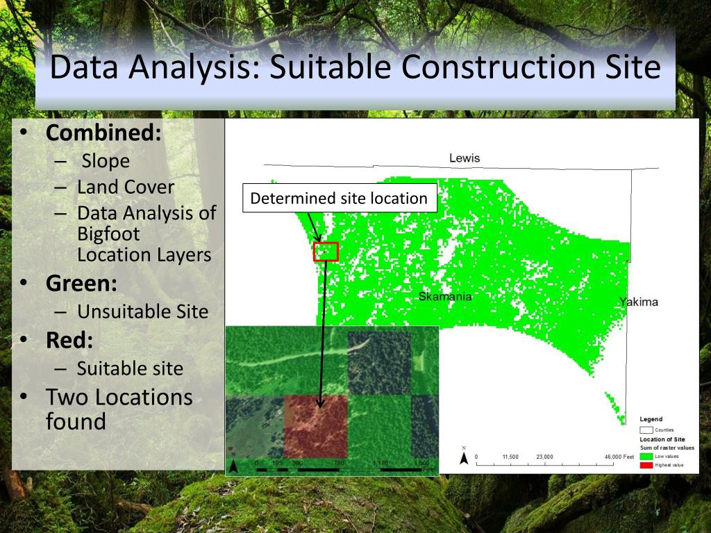 Data Analysis: Suitable Construction Site • Combined: • Slope • Land Cover • Data Analysis of Bigfoot Location Layers • Green: • Unsuitable Site • Red: • Suitable site • Two Locations found Determined site location