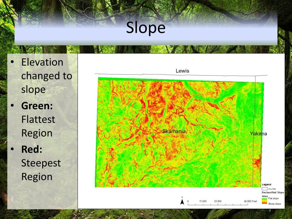Slope • Elevation changed to slope • Green: Flattest Region • Red: Steepest Region