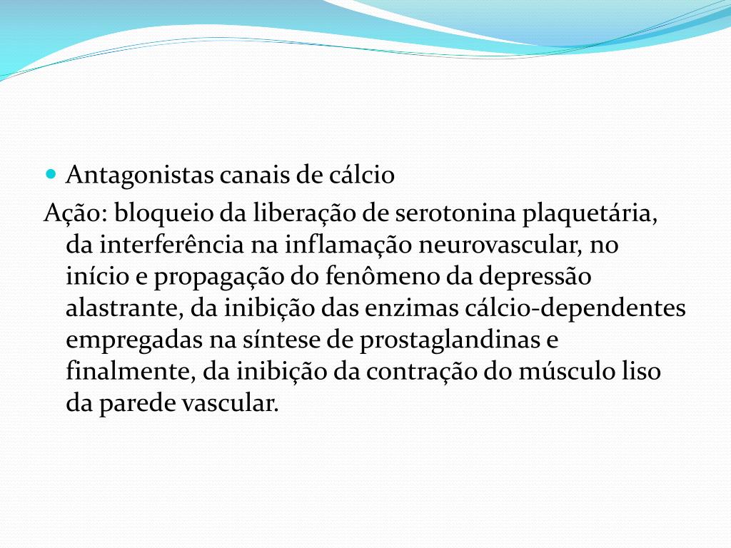 Antagonistas canais de cálcio Ação: bloqueio da liberação de serotoninaplaquetária, da interferência na inflamação neurovascular, no início e propagação do fenômeno da depressão alastrante, da inibição das enzimas cálcio-dependentes empregadas na síntese de prostaglandinas e finalmente, da inibição da contração do músculo liso da parede vascular.