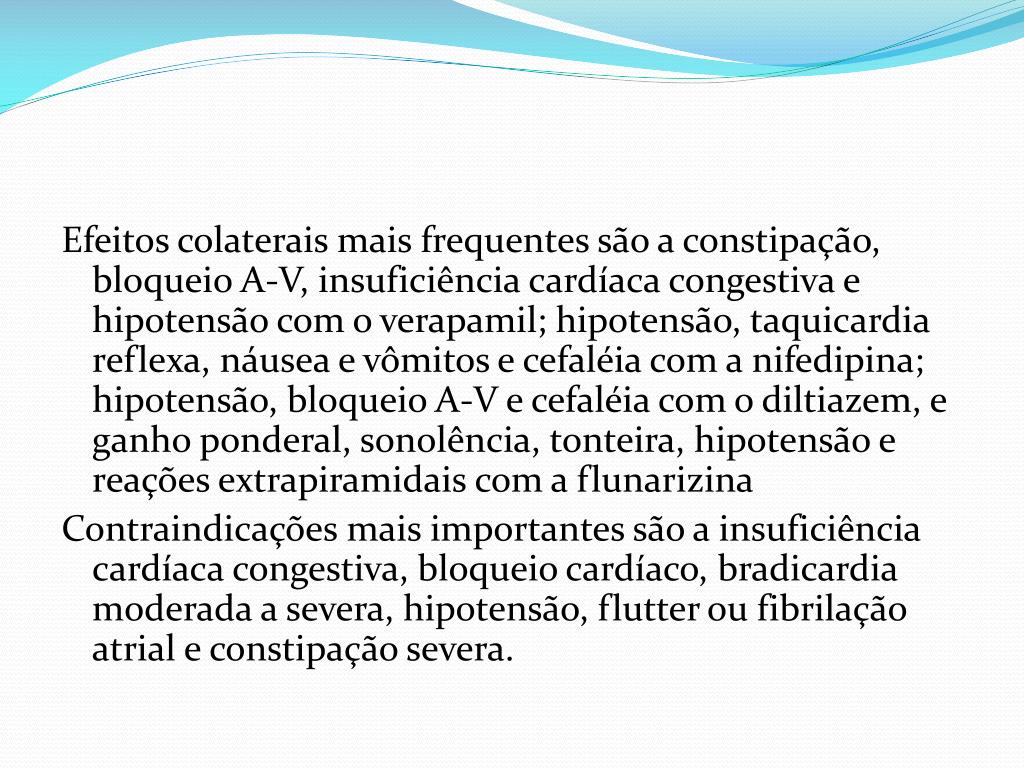 Efeitos colaterais mais frequentes são a constipação, bloqueio A-V, insuficiência cardíaca congestiva e hipotensão com o verapamil; hipotensão, taquicardia reflexa, náusea e vômitos e cefaléia com a nifedipina; hipotensão, bloqueio A-V e cefaléia com o diltiazem, e ganho ponderal, sonolência, tonteira, hipotensão e reações extrapiramidais com a flunarizina Contraindicações mais importantes são a insuficiência cardíaca congestiva, bloqueio cardíaco, bradicardia moderada a severa, hipotensão, flutter ou fibrilação atrial e constipação severa.