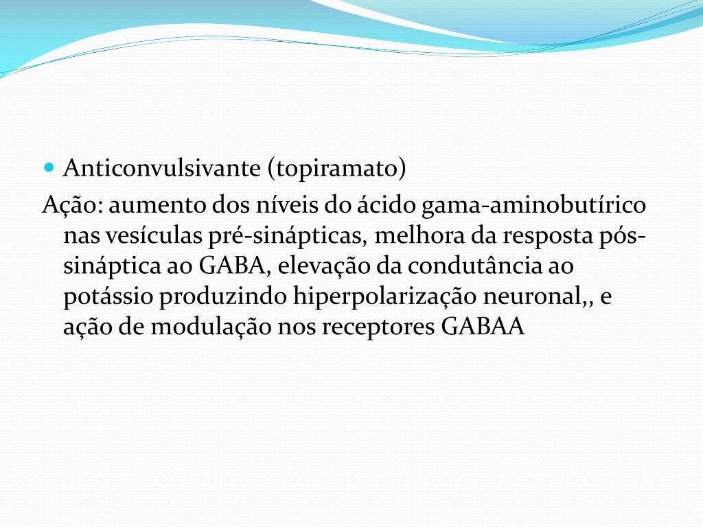 Anticonvulsivante (topiramato) Ação: aumento dos níveis do ácido gama-aminobutírico nas vesículas pré-sinápticas, melhora da resposta pós-sináptica ao GABA, elevação da condutância ao potássio produzindo hiperpolarização neuronal,, e ação de modulação nos receptores GABAA
