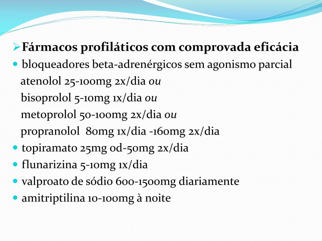 Fármacos profiláticos com comprovada eficácia • bloqueadores beta-adrenérgicos sem agonismo parcial atenolol 25-100mg 2x/dia ou bisoprolol 5-10mg 1x/dia ou metoprolol 50-100mg 2x/dia ou propranolol 80mg 1x/dia -160mg 2x/dia • topiramato 25mg od-50mg 2x/dia • flunarizina 5-10mg 1x/dia • valproato de sódio 600-1500mg diariamente • amitriptilina 10-100mg à noite
