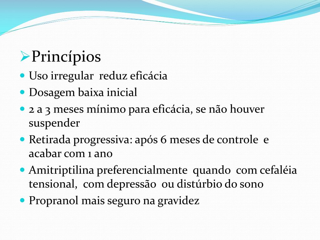 Princípios • Uso irregular reduz eficácia • Dosagem baixa inicial • 2 a 3 meses mínimo para eficácia, se não houver suspender • Retirada progressiva: após 6 meses de controle e acabar com 1 ano • Amitriptilina preferencialmente quando com cefaléia tensional, com depressão ou distúrbio do sono • Propranol mais seguro na gravidez