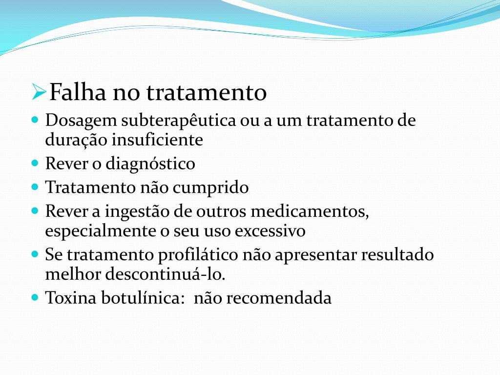Falha no tratamento • Dosagem subterapêutica ou a um tratamento de duração insuficiente • Rever o diagnóstico • Tratamento não cumprido • Rever a ingestão de outros medicamentos, especialmente o seu uso excessivo • Se tratamento profilático não apresentar resultado melhor descontinuá-lo. • Toxina botulínica: não recomendada