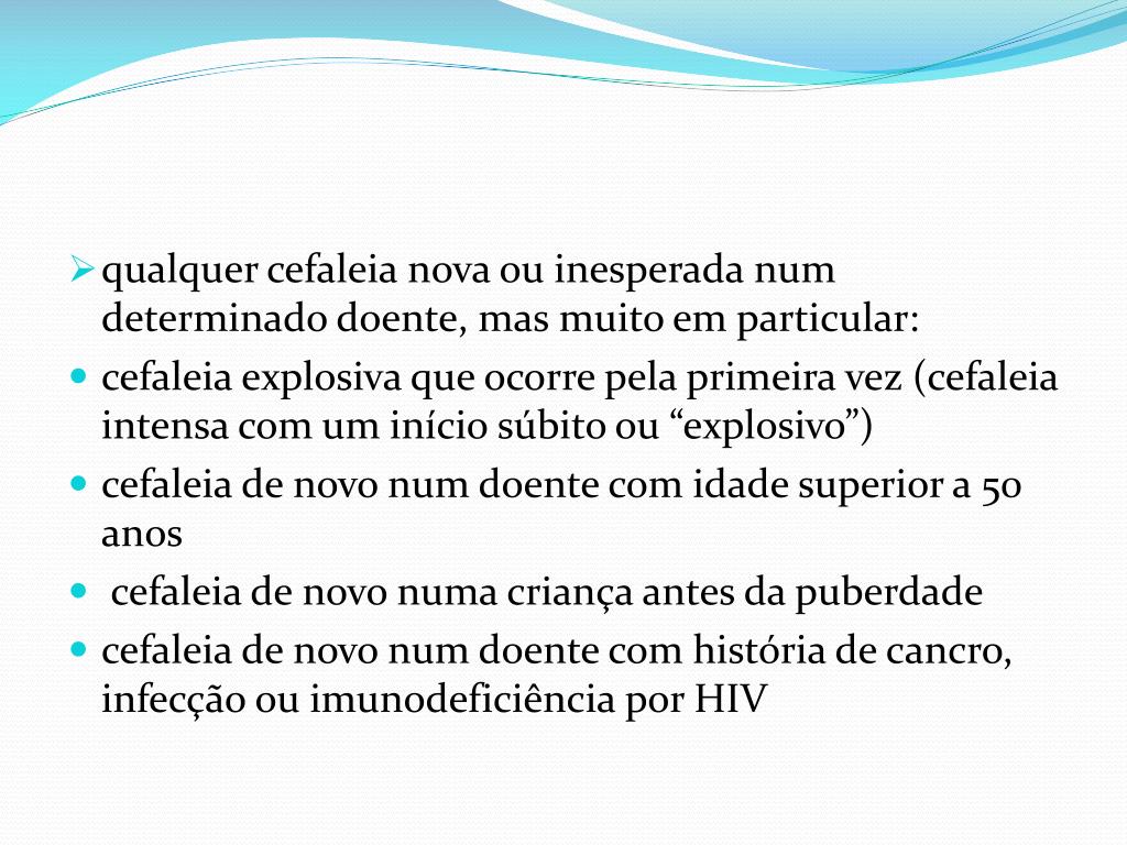 qualquer cefaleia nova ou inesperada num determinado doente, mas muito em particular: • cefaleia explosiva que ocorre pela primeira vez (cefaleia intensa com um início súbito ou “explosivo”) • cefaleia de novo num doente com idade superior a 50 anos • cefaleia de novo numa criança antes da puberdade • cefaleia de novo num doente com história de cancro, infecção ou imunodeficiência por HIV