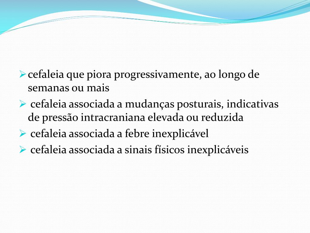 cefaleia que piora progressivamente, ao longo de semanas ou mais • cefaleia associada a mudanças posturais, indicativas de pressão intracraniana elevada ou reduzida • cefaleia associada a febre inexplicável • cefaleia associada a sinais físicos inexplicáveis