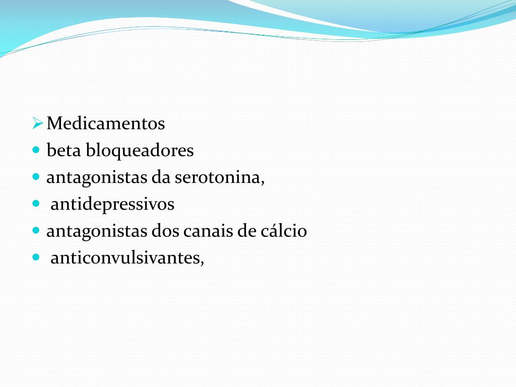 Medicamentos • beta bloqueadores • antagonistas da serotonina, • antidepressivos • antagonistas dos canais de cálcio • anticonvulsivantes,