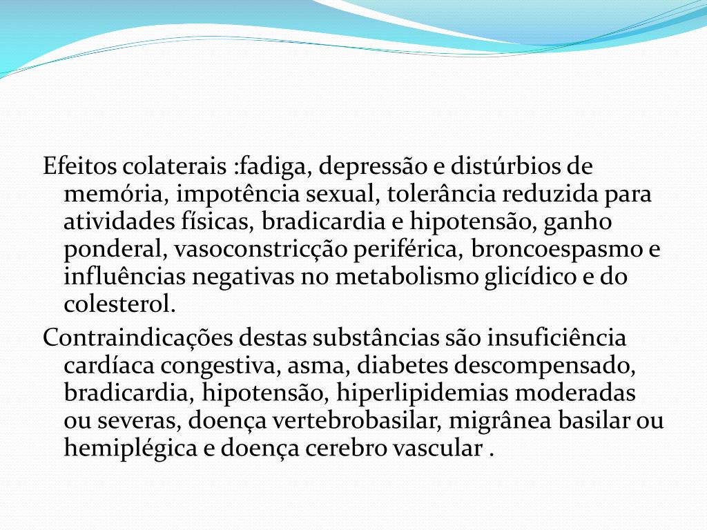 Efeitos colaterais :fadiga, depressão e distúrbios de memória, impotência sexual, tolerância reduzida para atividades físicas, bradicardia e hipotensão, ganho ponderal, vasoconstricção periférica, broncoespasmo e influências negativas no metabolismo glicídico e do colesterol. Contraindicações destas substâncias são insuficiência cardíaca congestiva, asma, diabetes descompensado, bradicardia, hipotensão, hiperlipidemias moderadas ou severas, doença vertebrobasilar, migrânea basilar ou hemiplégica e doença cerebro vascular .