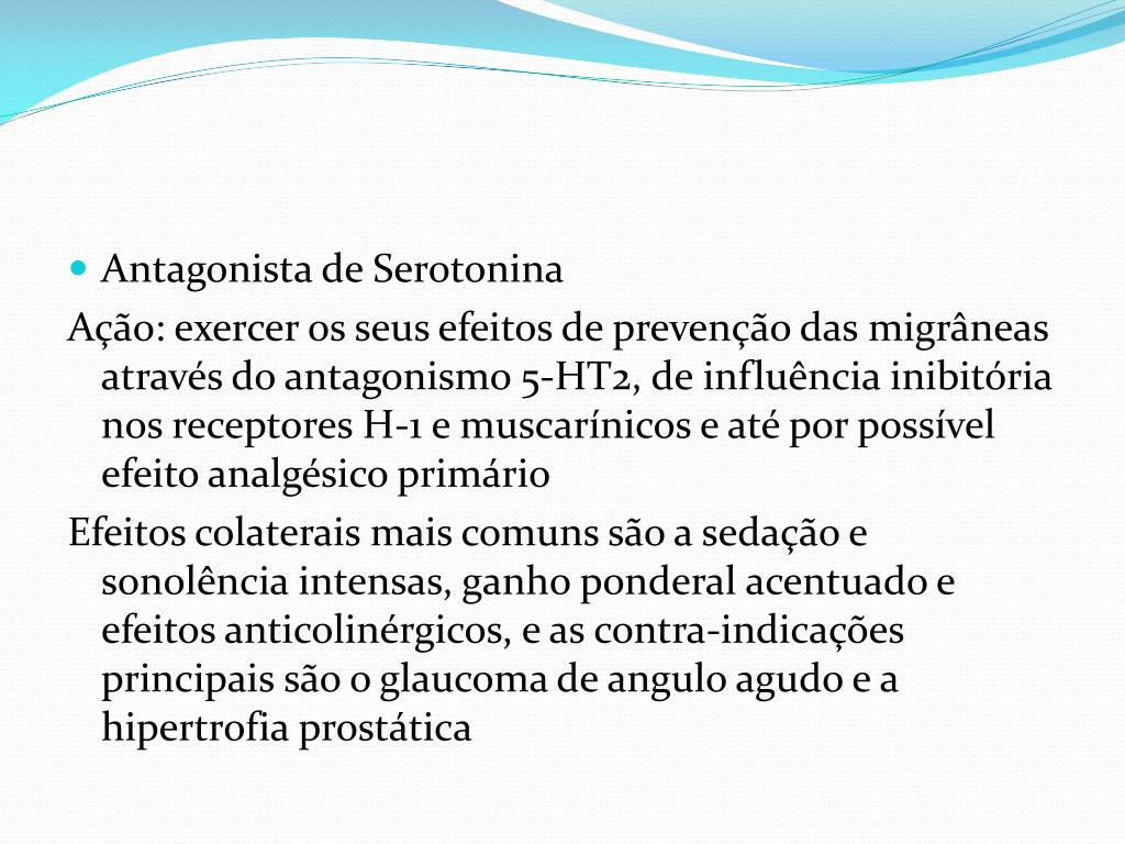 Antagonista de Serotonina Ação: exercer os seus efeitos de prevenção das migrâneas através do antagonismo 5-HT2, de influência inibitória nos receptores H-1 e muscarínicos e até por possível efeito analgésico primário Efeitos colaterais mais comuns são a sedação e sonolência intensas, ganho ponderal acentuado e efeitos anticolinérgicos, e as contra-indicações principais são o glaucoma de angulo agudo e a hipertrofia prostática