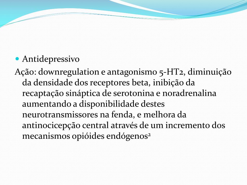 Antidepressivo Ação: downregulation e antagonismo 5-HT2, diminuição da densidade dos receptores beta, inibição da recaptação sináptica de serotonina e noradrenalina aumentando a disponibilidade destes neurotransmissores na fenda, e melhora da antinocicepção central através de um incremento dos mecanismos opióides endógenos2