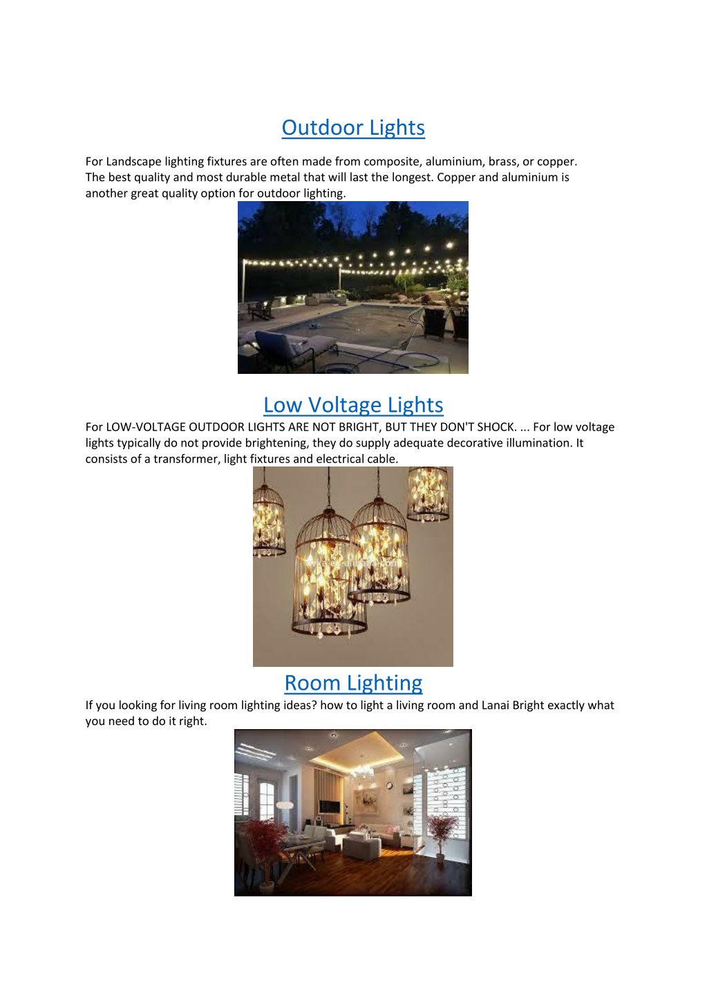 Outdoor Lights For Landscape lighting fixtures are often made from composite, aluminium, brass, or copper. The best quality and most durable metal that will last the longest. Copper and aluminium is another great quality option for outdoor lighting. Low Voltage Lights For LOW-VOLTAGE OUTDOOR LIGHTS ARE NOT BRIGHT, BUT THEY DON'T SHOCK. ... For low voltage lights typically do not provide brightening, they do supply adequate decorative illumination. It consists of a transformer, light fixtures and electrical cable. Room Lighting If you looking for living room lighting ideas? how to light a living room and Lanai Bright exactly what you need to do it right.