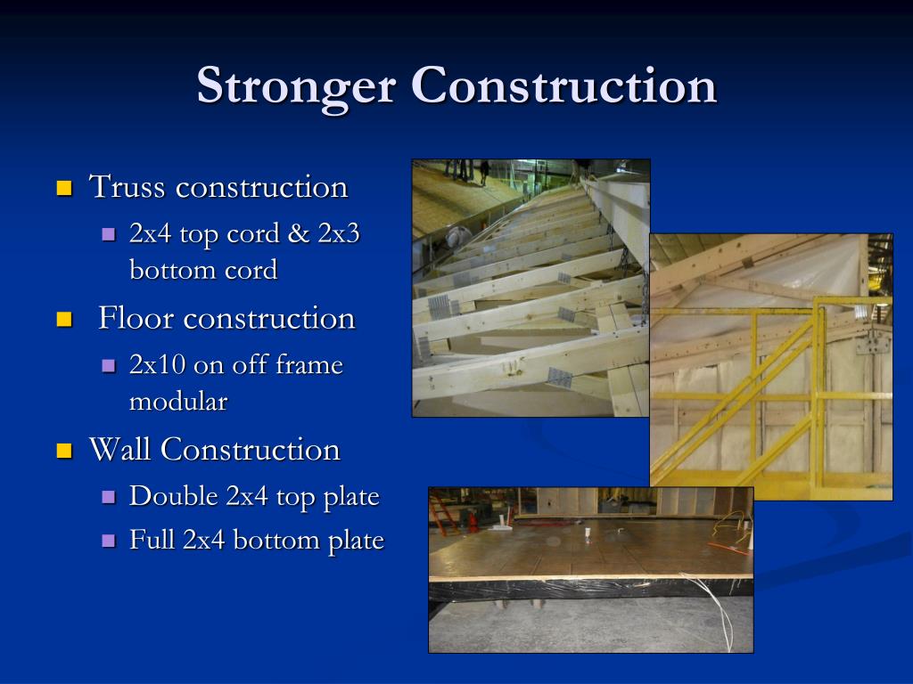 Stronger Construction • Truss construction • 2x4 top cord & 2x3 bottom cord • Floor construction • 2x10 on off frame modular • Wall Construction • Double 2x4 top plate • Full 2x4 bottom plate