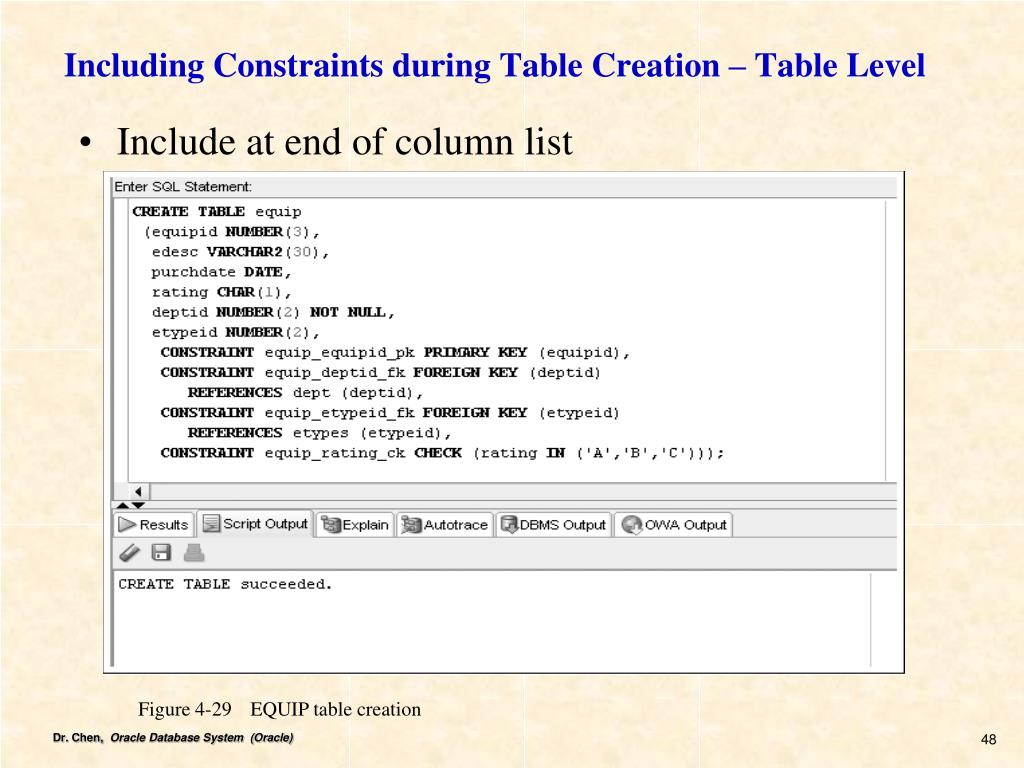 Including Constraints during Table Creation – Table Level • Include at end of column list Figure 4-29 EQUIP table creation