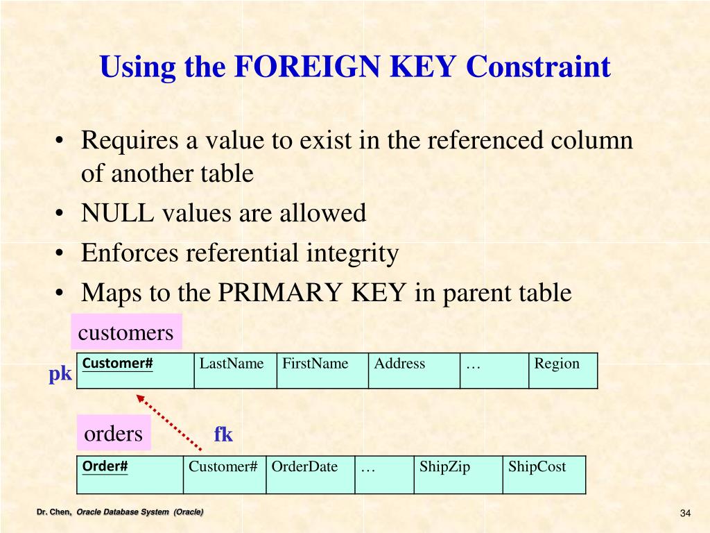 Using the FOREIGN KEY Constraint • Requires a value to exist in the referenced column of another table • NULL values are allowed • Enforces referential integrity • Maps to the PRIMARY KEY in parent table customers pk orders fk