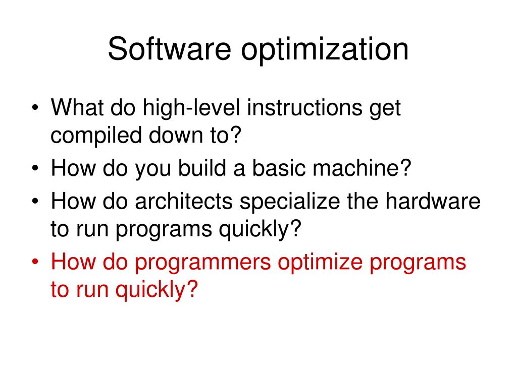 Software optimization • What do high-level instructions get compiled down to? • How do you build a basic machine? • How do architects specialize the hardware to run programs quickly? • How do programmers optimize programs to run quickly?