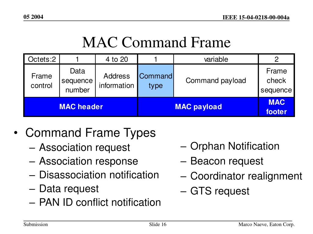 MAC Command Frame • Command Frame Types • Association request • Association response • Disassociation notification • Data request • PAN ID conflict notification • Orphan Notification • Beacon request • Coordinator realignment • GTS request Marco Naeve, Eaton Corp.