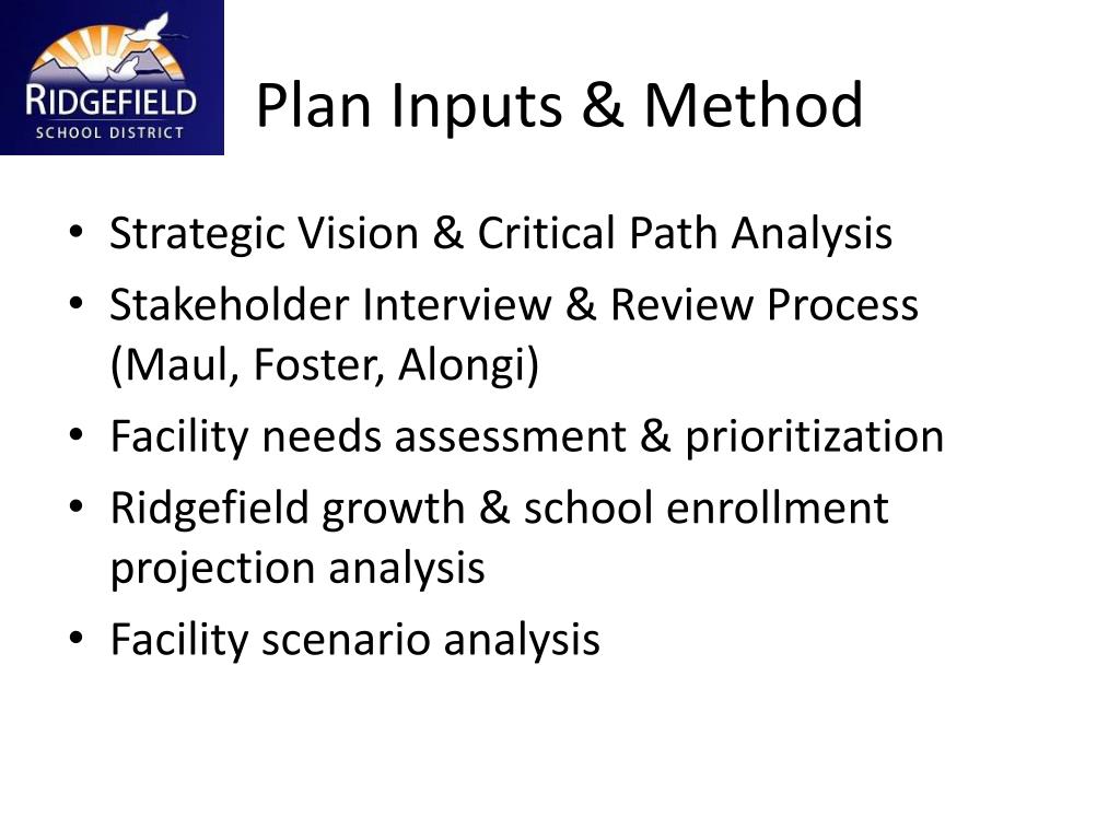 Plan Inputs & Method • Strategic Vision & Critical Path Analysis • Stakeholder Interview & Review Process (Maul, Foster, Alongi) • Facility needs assessment & prioritization • Ridgefield growth & school enrollment projection analysis • Facility scenario analysis