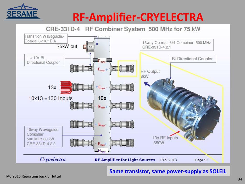 RF Amplifier Intended : Use 500 MHz solid state amplifier (0.6 kW Module) developed at SOLEIL Needed: 4 x 80 kW from 4 x 10 x 16 x 0.5 kW Status: 16 Modules combined and tested by SOLEIL. 40 kW tower will be built up by SOLEIL for THOMX (Beginning 2014). Export of Technology from SOLEIL to SESAME on halt (May 2013) Export approval received (Aug.2013) Intended:Built up of one 80 kW tower (Demonstrator) by SOLEIL, sold to SESAME. Participation of SESAME. Licensing of 500 MHz technology from SOLEIL to SIGAM-PHI-Electronics? Purchasing of further 3 towers from SIGMA-PHI-Electronics? Cost?