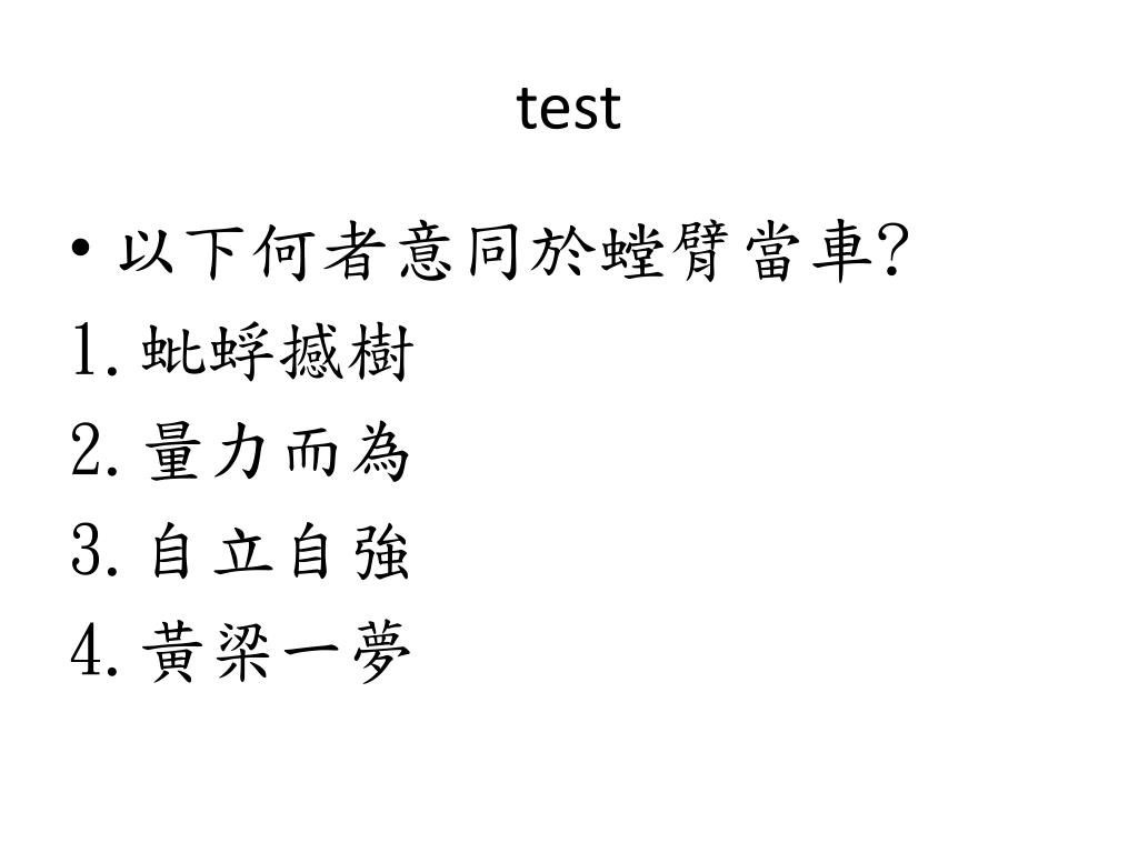 test • 以下何者意同於螳臂當車? 1.蚍蜉撼樹 2.量力而為 3.自立自強 4.黃梁一夢