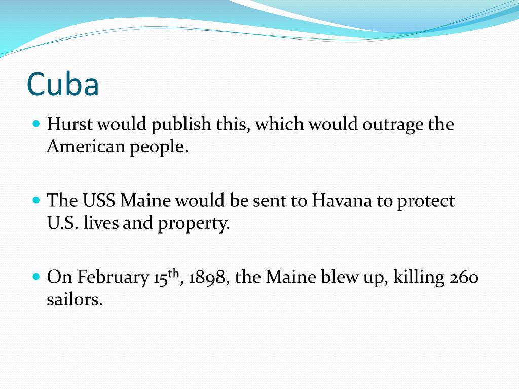 Cuba • Hurst would publish this, which would outrage the American people. • The USS Maine would be sent to Havana to protect U.S. lives and property. • On February 15th, 1898, the Maine blew up, killing 260 sailors.