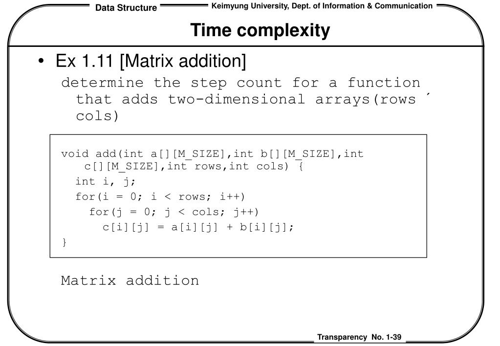 Time complexity • Ex 1.11 [Matrix addition] • determine the step count for a function that adds two-dimensional arrays(rows ´ cols) • void add(int a[][M_SIZE],int b[][M_SIZE],int c[][M_SIZE],int rows,int cols) { • int i, j; • for(i = 0; i < rows; i++) • for(j = 0; j < cols; j++) • c[i][j] = a[i][j] + b[i][j]; • } • Matrix addition
