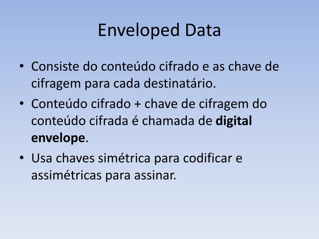 Enveloped Data • Consiste do conteúdo cifrado e as chave de cifragem para cada destinatário. • Conteúdo cifrado + chave de cifragem do conteúdo cifrada é chamada de digital envelope. • Usa chaves simétrica para codificar e assimétricas para assinar.