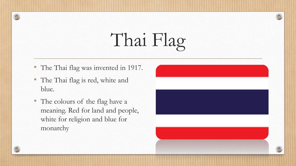 Thai Flag • The Thai flag was invented in 1917. • The Thai flag is red, white and blue. • The colours of the flag have a meaning. Red for land and people, white for religion and blue for monarchy