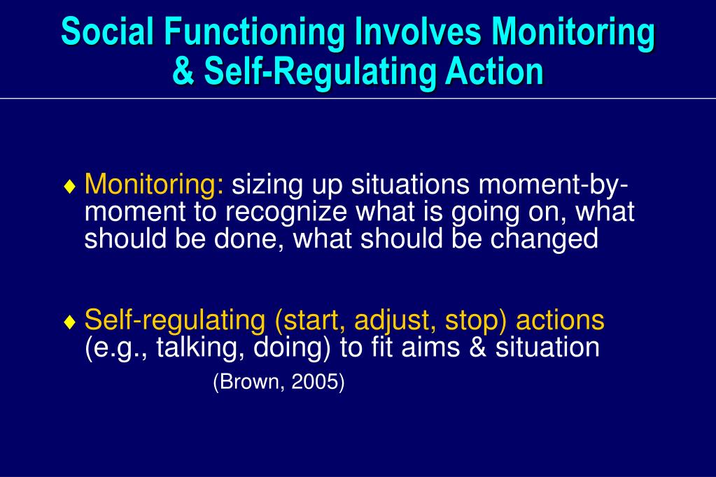 Social Functioning Involves Monitoring & Self-Regulating Action • Monitoring: sizing up situations moment-by-moment to recognize what is going on, what should be done, what should be changed • Self-regulating (start, adjust, stop) actions (e.g., talking, doing) to fit aims & situation (Brown, 2005)