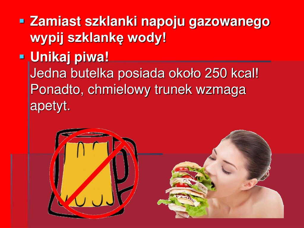 Zamiast szklanki napoju gazowanego wypij szklankę wody! • Unikaj piwa!Jedna butelka posiada około 250 kcal! Ponadto, chmielowy trunek wzmaga apetyt.