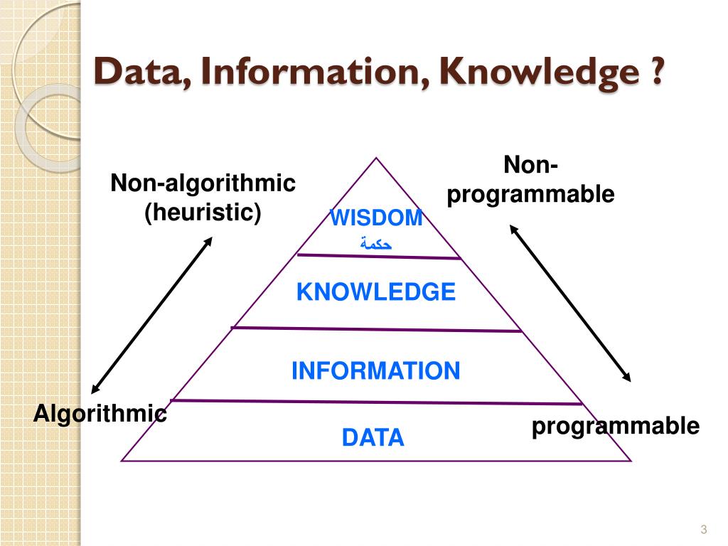 Data, Information, Knowledge ? Non-programmable Non-algorithmic(heuristic) WISDOM حكمة KNOWLEDGE INFORMATION Algorithmic programmable DATA