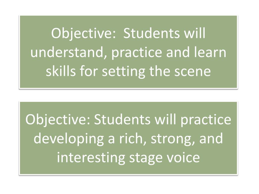 Objective: Students will understand, practice and learn skills for setting the scene Objective: Students will practice developing a rich, strong, and interesting stage voice