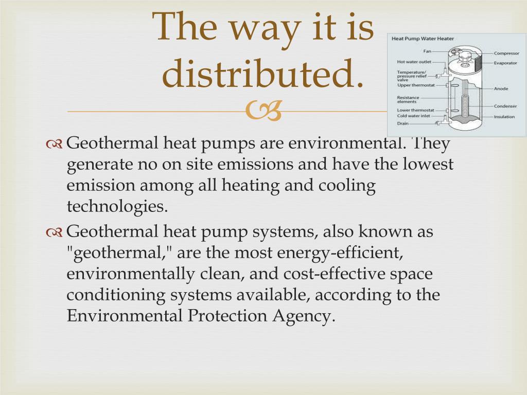 The way it is distributed. • Geothermal heat pumps are environmental. They generate no on site emissions and have the lowest emission among all heating and cooling technologies. • Geothermal heat pump systems, also known as "geothermal," are the most energy-efficient, environmentally clean, and cost-effective space conditioning systems available, according to the Environmental Protection Agency.