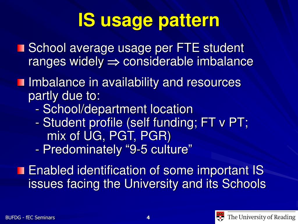 IS usage pattern • School average usage per FTE student ranges widely considerable imbalance • Imbalance in availability and resourcespartly due to: - School/department location - Student profile (self funding; FT v PT; mix of UG, PGT, PGR) - Predominately “9-5 culture” • Enabled identification of some important IS issues facing the University and its Schools