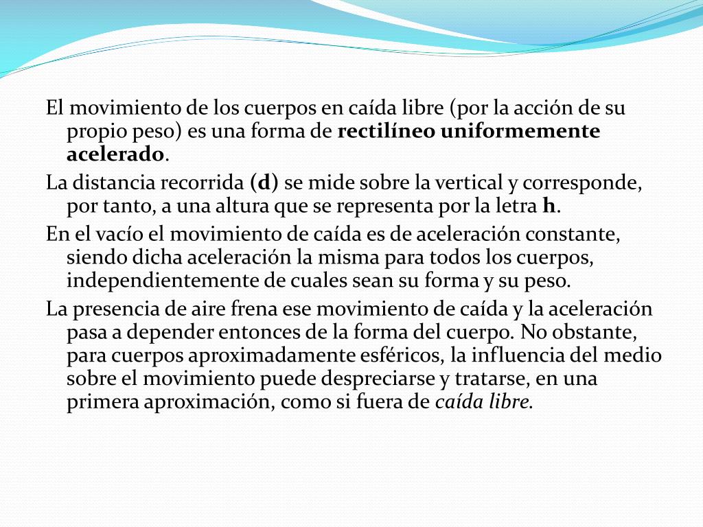 El movimiento de los cuerpos en caída libre (por la acción de su propio peso) es una forma de rectilíneo uniformemente acelerado. La distancia recorrida (d) se mide sobre la vertical y corresponde, por tanto, a una altura que se representa por la letra h. En el vacío el movimiento de caída es de aceleración constante, siendo dicha aceleración la misma para todos los cuerpos, independientemente de cuales sean su forma y su peso. La presencia de aire frena ese movimiento de caída y la aceleración pasa a depender entonces de la forma del cuerpo. No obstante, para cuerpos aproximadamente esféricos, la influencia del medio sobre el movimiento puede despreciarse y tratarse, en una primera aproximación, como si fuera de caída libre.