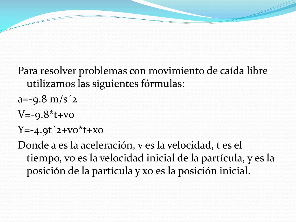 Para resolver problemas con movimiento de caída libre utilizamos las siguientes fórmulas: a=-9.8 m/s´2 V=-9.8*t+v0 Y=-4.9t´2+v0*t+x0 Donde a es la aceleración, v es la velocidad, t es el tiempo, v0 es la velocidad inicial de la partícula, y es la posición de la partícula y x0 es la posición inicial.