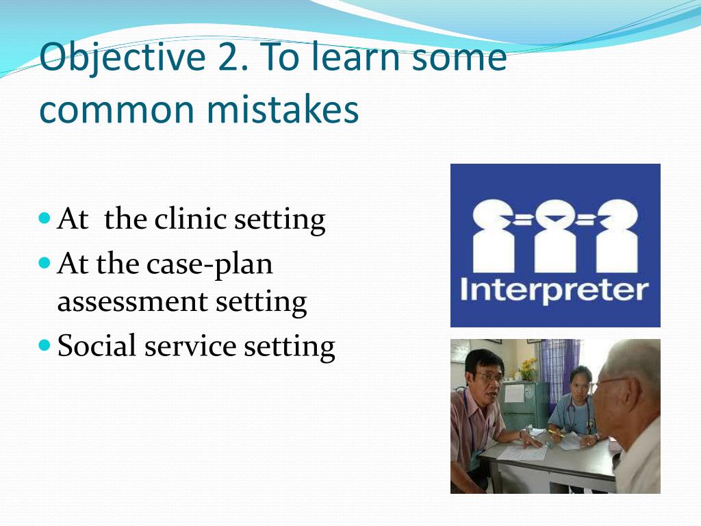 Objective 2. To learn some common mistakes • At the clinic setting • At the case-plan assessment setting • Social service setting