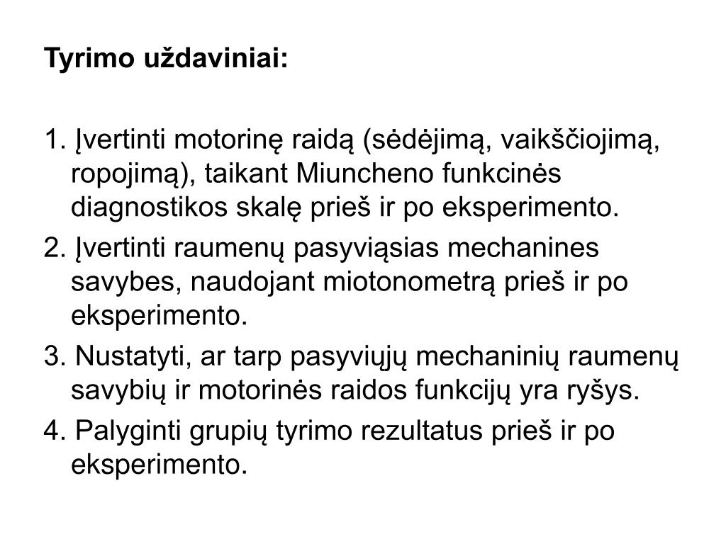Tyrimo uždaviniai: 1. Įvertinti motorinę raidą (sėdėjimą, vaikščiojimą, ropojimą), taikant Miuncheno funkcinės diagnostikos skalę prieš ir po eksperimento. 2. Įvertinti raumenų pasyviąsias mechanines savybes, naudojant miotonometrą prieš ir po eksperimento. 3. Nustatyti, ar tarp pasyviųjų mechaninių raumenų savybių ir motorinės raidos funkcijų yra ryšys. 4. Palyginti grupių tyrimo rezultatus prieš ir po eksperimento.