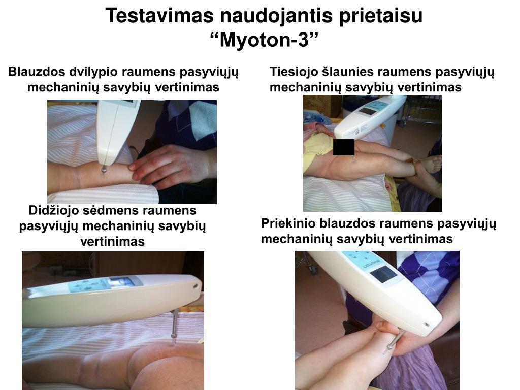 Testavimas naudojantis prietaisu “Myoton-3” Blauzdos dvilypio raumens pasyviųjų mechaninių savybių vertinimas Tiesiojo šlaunies raumens pasyviųjų mechaninių savybių vertinimas Didžiojo sėdmens raumenspasyviųjų mechaninių savybių vertinimas Priekinio blauzdos raumens pasyviųjų mechaninių savybių vertinimas